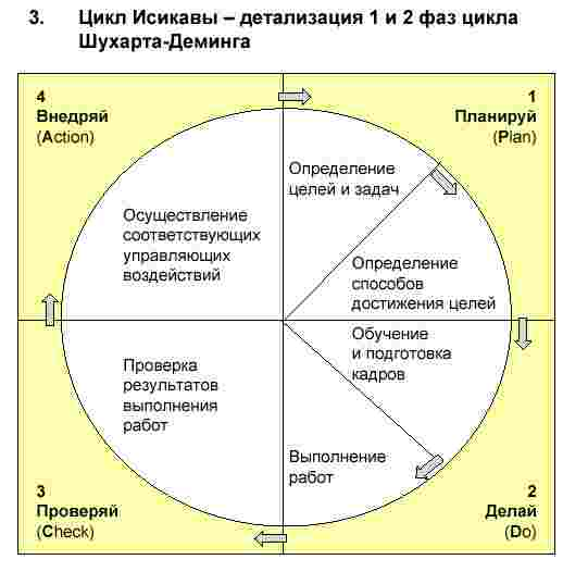 Э. Деминг пропагандировал использование цикла PDCA в качестве основного способа достижения непрерывного улучшения процессов. Он также ввел модификацию цикла PDCA - цикл PDSA ("study" - изучать). В 1950 г. Э. Деминг вдохновил японцев на использование цикла PDCA.
