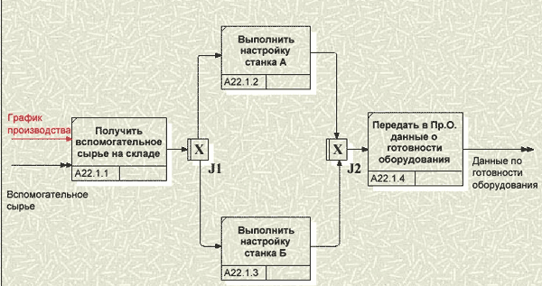 Методология IDEF3 (Integrated Definition Process Description Capture Method) была разработана с целью более удобного описания рабочих процессов (Work Flow), для которых важно отразить логическую последовательность выполнения процедур. Эта методика, в отличии от IDEF0, не стандартизирована. С ее описанием можно познакомиться на сайте http://www.idef.com [13]. На рисунке представлен пример IDEF3-модели.