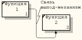 Связь выход-механизм (рис. 11) отражает ситуацию, при которой выход одной функции становится средством достижения цели для другой, то есть выход одного блока направляется на механизм другого. Такая связь показывает, что одна функция подготавливает ресурсы, необходимые для другой функции. Связи выход-механизм возникают при отображении в модели процедур выполнения и распределения ресурсов, создания или подготовки средств для выполнения функций системы (например, приобретение или изготовление инструментов и оборудования, обучение персонала, финансирование, закупка материалов).
