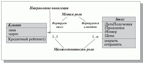 рис. 11.3 иллюстрирует модель формирования заказа. Каждый заказ может быть создан единственным клиентом (множественность роли 1.1). Каждый клиент может создать один и более заказов (множественность роли 1..n). Направление навигации показывает, что каждый заказ должен быть «привязан» к определенному клиенту.