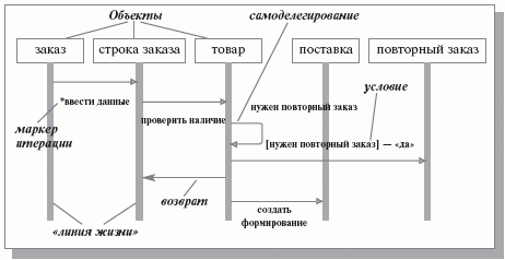 Сообщения появляются в той последовательности, как они показаны на диаграмме - сверху вниз. Если предусматривается отправка сообщения объектом самому себе (самоделегирование), то стрелка начинается и заканчивается на одной «линии жизни».