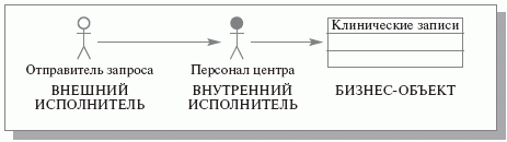 Следующим этапом проектирования ИС является разработка модели бизнес-объектов, которая показывает выполнение бизнес-процессов организации ее внутренними исполнителями. Основными компонентами моделей бизнес-объектов являются внешние и внутренние исполнители, а также бизнес-сущности, отображающие все, что используют внутренние исполнители для реализации бизнес-процессов. Пример модели бизнес-объектов для прецедента «Ответ на запрос» приведен на рис. 12.5 .