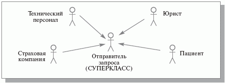 В этой диаграмме появилось новое действующее лицо - отправитель запроса. На самом деле с запросом о состоянии пациента могут обращаться в систему многие из действующих лиц: юрист, страховая компания, технический персонал и даже сам пациент. Таким образом, понятие «Отправитель запроса» служит для обобщенного представления всех этих действующих лиц при описании прецедента «Ответ на запрос» ( рис. 12.6 ). «Отправитель запроса» становится суперклассом по отношению к обобщаемым понятиям (подклассам).