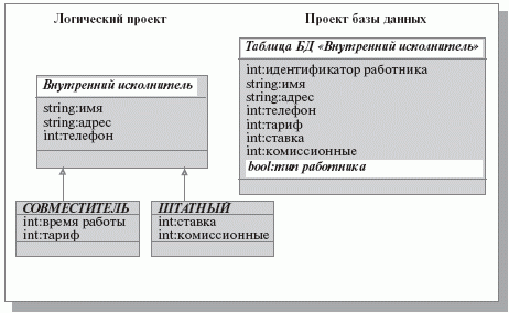 В первом случае для каждого из классов создается отдельная таблица, между которыми затем устанавливаются необходимые связи. Во втором случае создается таблица для суперкласса, а затем в каждую таблицу подклассов включаются столбцы для каждого из атрибутов суперкласса. В третьем - создается единая таблица, содержащая атрибуты как суперкласса, так и всех подклассов ( рис. 12.13 ). При этом для выделения исходных таблиц подклассов в результирующую таблицу добавляется один или более дополнительных столбцов (на рисунке показан курсивом).