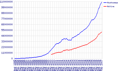 In the February 2007 survey we received responses from 108,810,358 sites, an increase of 1.93 million from last month. http://news.netcraft.com/archives/2007/02/02/ february_2007_web_server_survey.html