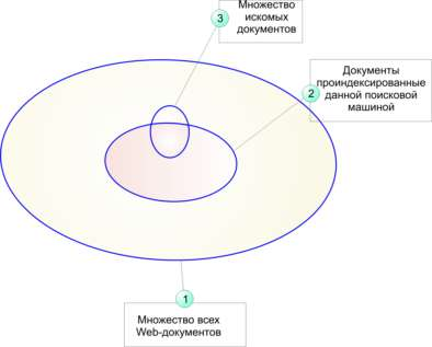 Эту мысль наглядно иллюстрирует рис. Эллипс 1 ограничивает множество всех Web-документов, существующих на некоторый момент времени, эллипс 2 - все документы, которые проиндексированы данной поисковой машиной, а эллипс 3 - искомые документы. Таким образом, найти с помощью данной поисковой машины можно лишь ту часть искомых документов, которые ею проиндексированы.