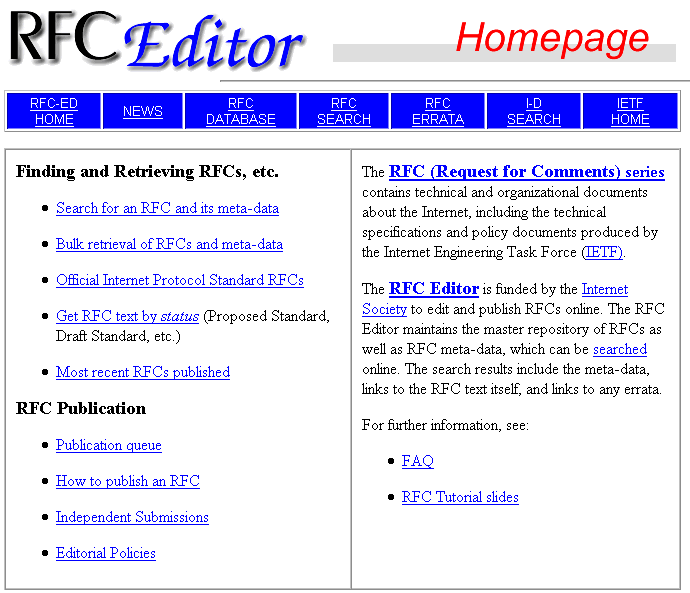 Rfc-editor.org. Создание серии документов RFC было инициировано еще в 1969 г. В данный момент редактированием RFC занимается маленький отдел в институте ISI (isi.edu)