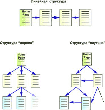 Система гиперссылок определяет структуру сайта - может быть линейной, древовидной, паутинной.