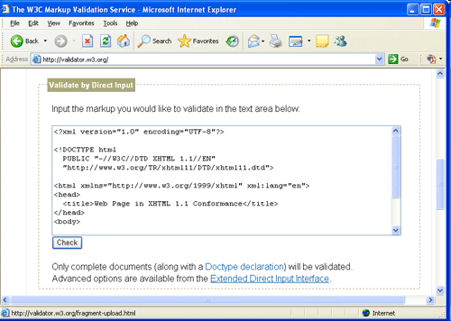 Существует три возможности для проверки страниц. Можно ввести URL страницы (убедившись, что страница доступна в Web), можно загрузить документ Web со своего локального ПК или можно скопировать свой код в текстовое поле. Последний метод показан на рисунке 1.13 , где для валидации введен код страницы примера, приведенного на Пример 23.6, «Код для указания соответствия страницы стандартам XHTML 1.1».