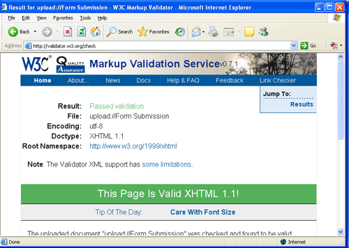 Так как запись !DOCTYPE на этой странице указывает на соответствие стандартам XHTML 1.1, то страница проверяется согласно этим стандартам. После нажатия кнопки "Check" выполняется валидация и выводится страница отчета.