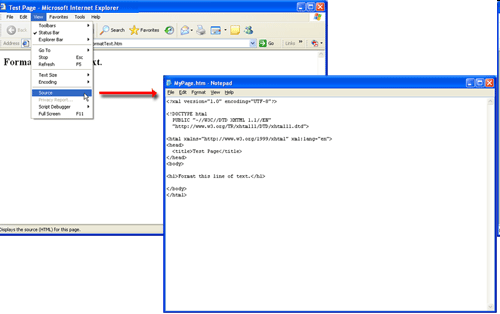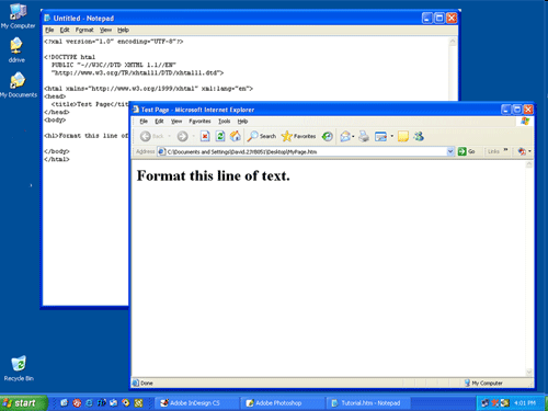 Следующая иллюстрация показывает экран компьютера с одновременно открытыми на рабочем столе программами Notepad и Internet Explorer. Теперь очень легко щелкнуть в окне Notepad, чтобы редактировать документ Web. После сохранения изменений щелкните в окне Internet Explorer, а затем нажмите кнопку Refresh, чтобы перезагрузить измененный документ. Затем вернитесь в окно Notepad, чтобы продолжить разработку страницы.
