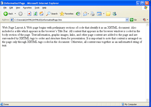 Ее представление существенно отличается от ее вывода в редакторе. Причина, конечно, в том, что в документе отсутствуют теги XHTML, которые руководят браузером при размещении текста на странице. Поэтому браузер воспринимает всю информацию как одну непрерывную строку текста. Все пробелы и переносы строк, присутствующие в редакторе, сокращаются до одиночных пробелов, разделяющих слова; в результате на странице получаем единственный блок текста.