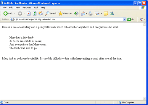 Тег <br/> не является контейнерным тегом; он не охватывает текст и не имеет дополнительного закрывающего тега. Этот пустой тег просто помещают внутри текста в том месте, где должен произойти разрыв строки. Этот тег удобно применять для вывода списков объектов, стихов или других объединений отдельных текстовых строк через один интервал. Следующий код использует перенос строк, например, для завершения отдельных строк стихотворения, помещенного в тег <blockquote>.