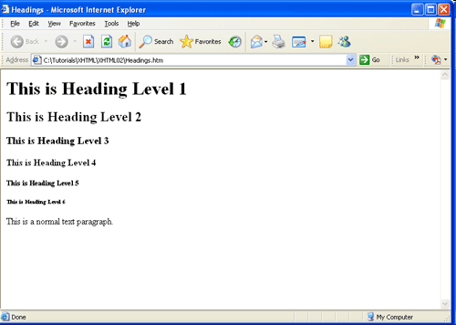 Число n в теге может изменяться от 1 (самый крупный) до 6 (самый мелкий). Эти шесть уровней заголовков приведены в следующем примере и выводятся в браузере, как показано на рисунке 2.10 . Стандартный параграф выводится для сравнения.