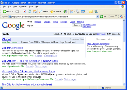 Кто-то может обладать талантом создавать свои собственные графические изображения, но большинству, вероятно, это не дано. Поэтому может понадобиться поискать существующие иллюстрации, которые будут дополнять текстовое содержимое на страницах. Web является богатым источником графики, и в сети существует множество изображений, которые можно использовать. Можно воспользоваться поисковой машиной, чтобы найти сайты репродукций, где можно выбирать из миллионов изображений. Иллюстрация на рисунке 2.13 показывает результаты поиска Google, содержащего более 32 миллионов источников репродукций.
