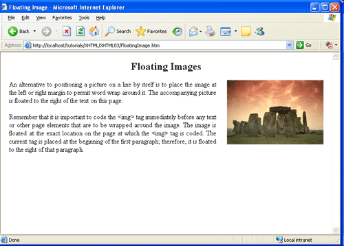Изображения, которые смещаются на странице влево или вправо, должны кодироваться сразу перед текстом, который окружает изображение. В приведенном выше примере тег <img/> находится в начале параграфа, который окружает изображение. Между изображением и окружающим контентом нет никаких символов переноса строк. Тегу <img/> присвоено свойство стиля float:right, чтобы поместить у правого поля охватывающего параграфа. Он имеет также параметр стиля margin-left:25px, чтобы оставить пустое пространство между изображением и окружающим текстом слева.