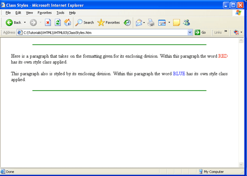 Классы стилей особенно подходят для тегов <span> и <div> для оформления строк текста и блоков кода, не связывая эти теги с определенным стилем. Эти теги становятся носителями множества различных стилей просто при присвоении им различных классов стилей. Следующий код является примером применения различных классов стилей к различным тегам для создания страницы, показанной на рисунке 3.16 .