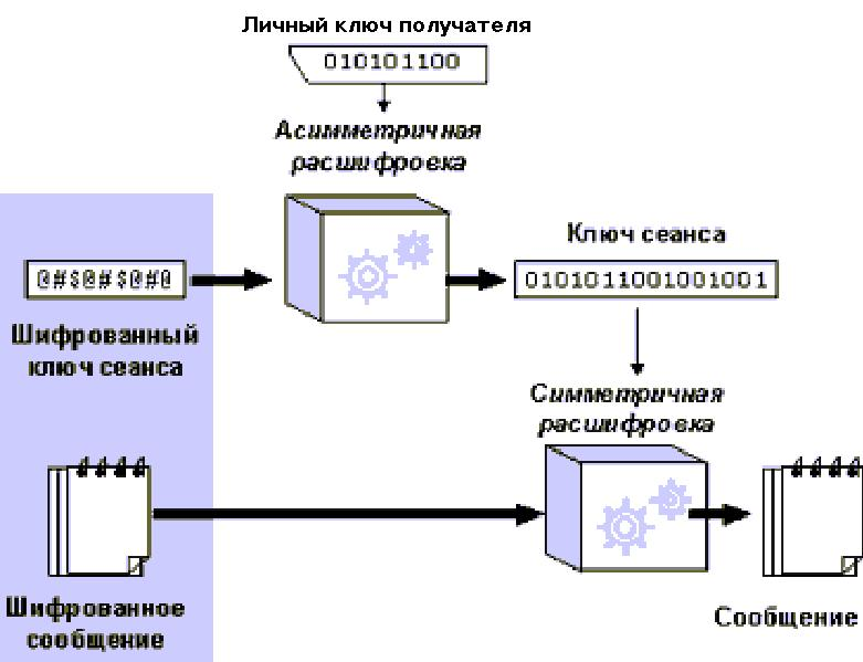 Как показано на рис. 11, процесс расшифровки происходит в обратном порядке. Личный ключ получателя используется для восстановления временного сеансового ключа, который, в свою очередь, используется при запуске быстрого алгоритма с секретным ключом для расшифровки основного тела сообщения.