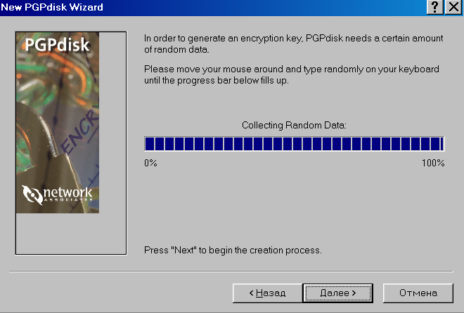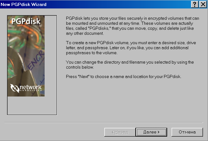 80. Выберите New, после чего на экране появится мастер создания PGP диска (рис. 49), выберите Далее.