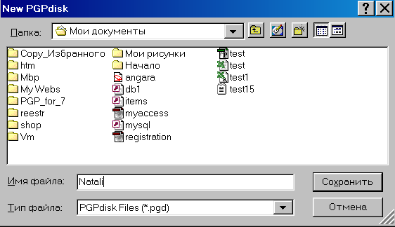 81. В окне New PGPdisk (рис. 50) выберите место расположения диска: в поле Папка выберите Мои документы, в поле Имя файла введите Natali, выберите Сохранить.