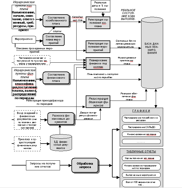 Технология решения задач планирования в системе может позволять начинать процесс планирования как с составления календарного плана хозяйственных мероприятий, так и с формирования финансового плана, связывая пункты финансового плана с пунктами хозяйственного плана. Могут быть рекомендованы следующие особенности реализации задачи планирования в системе: