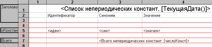 Просмотр констант в списке, появляющимся в окне сообщений весьма затруднителен. Лучше вывод констант (и других представляемых в виде таблиц объектов) обеспечивается с использованием элемента диалога Таблица значений.
