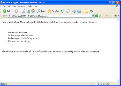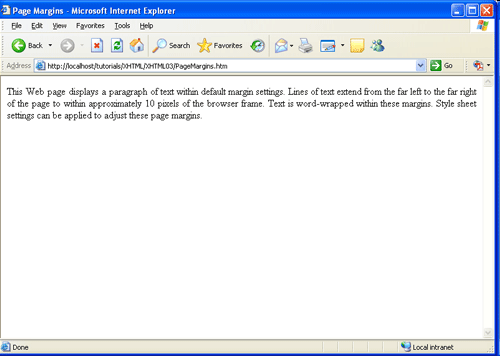 Когда текст выводится в окне браузера, он распространяется от одного края окна до другого с полями примерно в 6 мм (четверть дюйма), окружающими текст на странице. Можно было видеть эти поля на созданных ранее страницах Web. Они показаны на простой странице Web с одним параграфом на рисунке 3.3 .