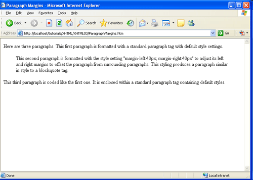 <p>Здесь три параграфа. Первый параграф форматирован с помощью стандартного тега параграфа с используемыми по умолчанию настройками стиля.</p> <p style="margin-left:40px; margin-right:40px">Второй параграф форматирован с настройкой стиля "margin-left:40px; margin-right:40px" для задания левого и правого полей для смещения параграфа относительно окружающих параграфов. Это оформление создает параграф, похожий по результату на использование тега blockquote.</p> <p>Третий параграф кодируется так же, как и первый. Он заключен в стандартный тег параграфа с используемым по умолчанию оформлением.</p>