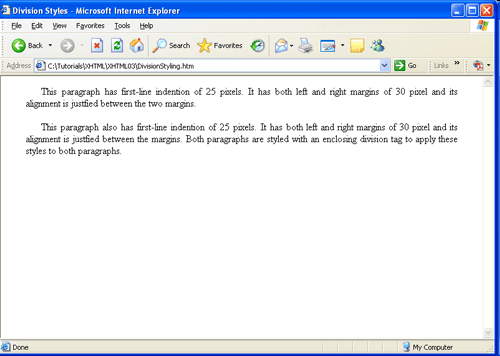 Использование тега <div> иллюстрируется двумя следующими параграфами. Оба параграфа оформляются одинаково. Однако вместо кодирования этих стилей с помощью линейных таблиц стилей в обоих тегах <p>, параграфы окружены тегом <div>, который определяет эти стили. Параграфы наследуют стили охватывающего тега <div>. Вывод браузером этого форматирования показан на рисунке 3.15 .