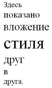 Приведенная выше страница включает вложенные таблицы стилей, где внутренняя настройка стиля наследует и затем временно переопределяет, или изменяет, настройки внешнего стиля. Внешний стиль <body>, например, задает вывод страницы шрифтом типа Arial размером 12 пунктов с полями страницы 20 пикселей и отступом параграфа 25 пикселей. Эти настройки остаются в силе, пока не будут переопределены, например, вложенными стилями <div>, которые изменяют поля для двух вложенных параграфов на 25 пикселей и задают отступ параграфа как 0 пикселей. Эти стили разделов переопределяются далее в одном из вложенных параграфов, в котором стиль шрифта изменяется на Comic Sans MS 13 пунктов, сохраняя поля и отступ из раздела. В этом параграфе теги <span> используются для переопределения стиля параграфа для отдельных строк текста, которые будут иметь отличающийся тип шрифта и раз меры. Таблицы стилей могут вкладываться друг в друга, так что стили каскадно спускаются на любое количество уровней. Окончание действия настроек стиля происходит в обратном порядке. Этот момент иллюстрирует следующий код, показывающий структуру со сдвигами тегов <span>, которые применяют, а затем удаляют увеличивающиеся размеры шрифта с помощью линейных таблиц стилей.